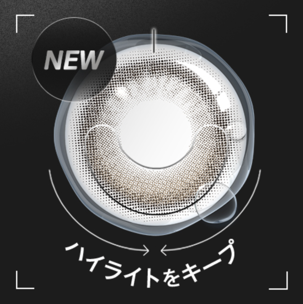 ティアティントは、レンズの一部に厚み(重み)をつけることで、ハイライトデザインが下に留まるように設計されています。まばたきなどによるレンズの回転を抑え、ハイライト部分が真下からズレにくく、安定した位置をキープできます。